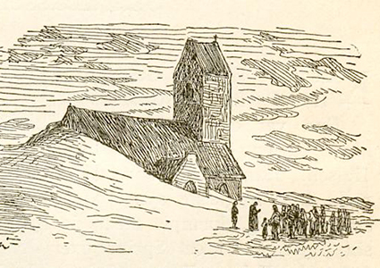 En sandflugt, som begyndte i det l6. århundrede nåede kirken i slutningen af det l7. århundrede. Menigheden måtte derfor grave sig ind, når der var gudstjeneste. Den ulige kamp mod sandflugten varede lige til l795, hvor kirken efter kongelig ordre blev nedrevet.