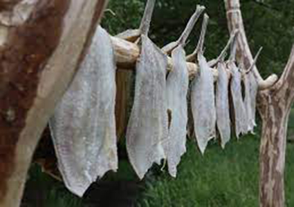 I "Højen" eller Gammel-Skagen hænger i lange rækker, den ene over den anden, opskårne fisk for at tørre i vinden.
